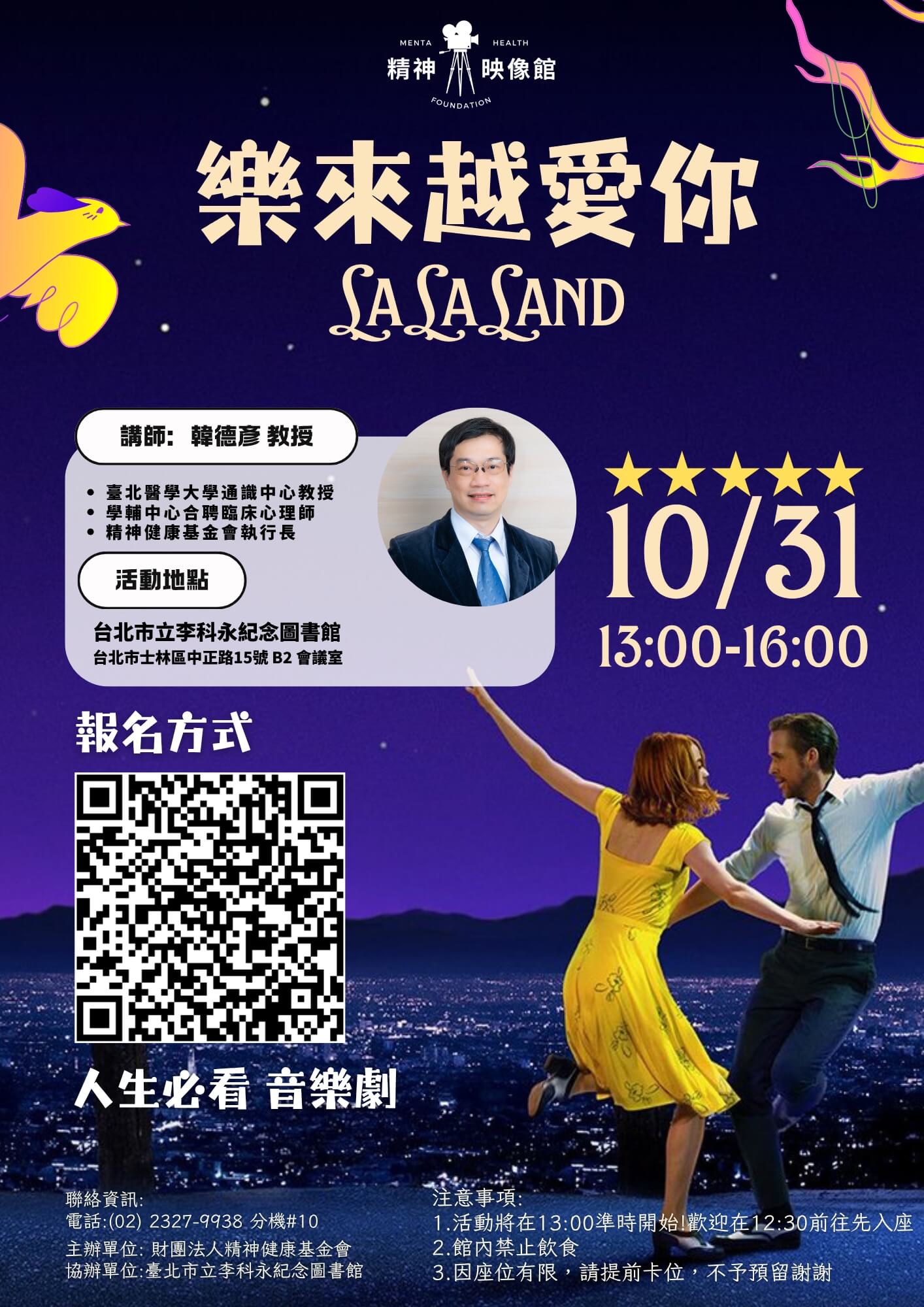 🌟本次影展將由精神健康基金會執行長 韓德彥 帶領大家賞析電影《樂來越愛你》。影片以繽紛的音樂與色彩,描繪出現代人面對夢想與現實的掙扎,在浪漫與遺憾之間,尋找屬於自己的步調。韓執行長將於觀影後帶領觀眾一同探討:在人生追夢的過程中,我們如何平衡理想與關係?當愛與夢想無法並行時,心靈的力量又如何帶領我們前行?
